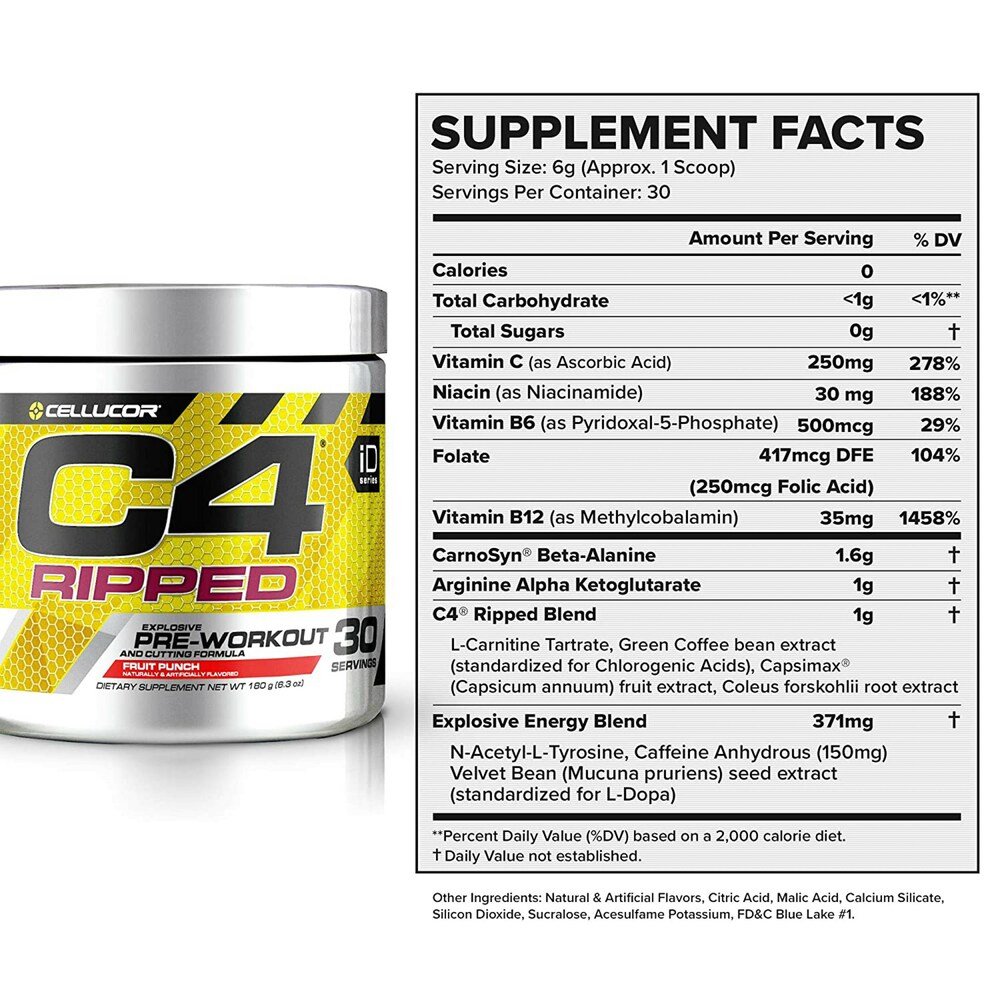 Boost your workout performance with Cellucor C4 Ripped Pre-Workout, a powerful formula combining explosive energy with fat-burning support. Packed with Beta-Alanine, Arginine, Green Coffee Extract, and Capsimax, this supplement enhances endurance, focus, and metabolism. With 30 servings per container, it’s the perfect choice for athletes and fitness enthusiasts aiming for energy, performance, and a lean physique.