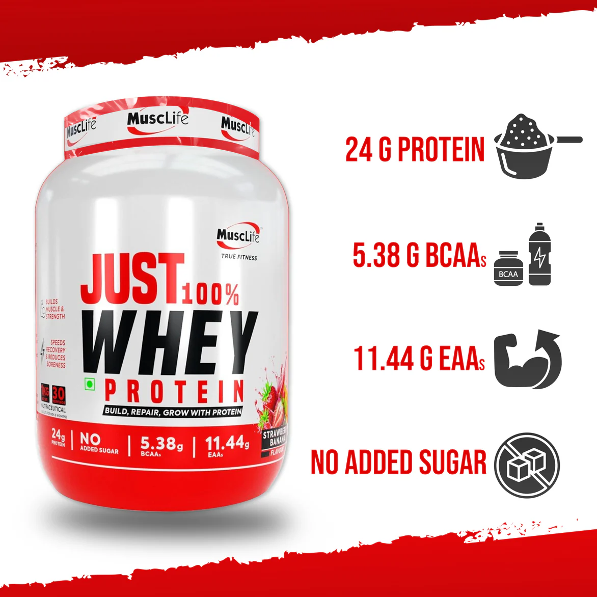 MuscLife Just 100% Whey Protein is a premium-quality protein supplement formulated to support muscle growth, strength, and faster recovery. Delivering 24 g protein per serving, along with 5.38 g BCAAs and 11.44 g EAAs, this whey protein helps build lean muscle without added sugar. Ideal for gym-goers, athletes, and fitness enthusiasts, available in delicious Strawberry Banana and Almond Kheer flavours.
