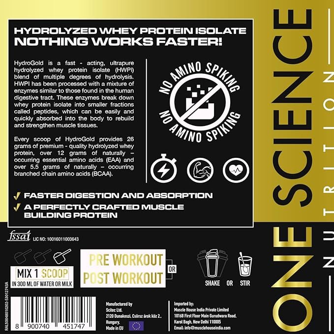 One Science Hydro Gold is an advanced hydrolyzed whey protein isolate (HWPI) designed for athletes, bodybuilders, and fitness enthusiasts who demand maximum absorption, rapid recovery, and superior muscle support. Through a specialized hydrolysis process, the protein is broken down into smaller peptides, allowing for faster digestion and quicker delivery of amino acids to muscles.