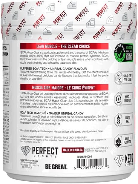 Fuel your workouts with Perfect Sports BCAA Hyper Clear, a refreshing and highly effective BCAA formula (2:1:1 ratio) designed to support muscle recovery, endurance, and lean muscle growth. Each serving delivers 5g of BCAAs (Leucine, Isoleucine, Valine) to help reduce muscle breakdown and enhance performance during intense training.