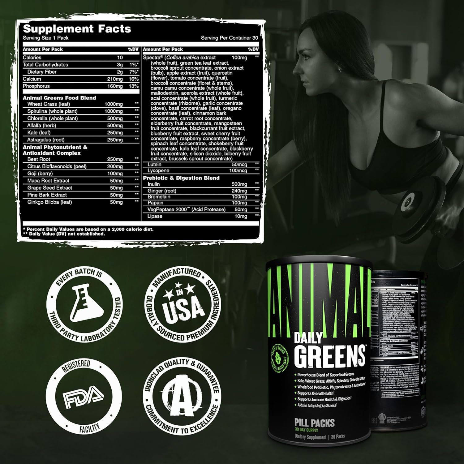 Animal Daily Greens also includes probiotics and digestive enzymes, which play a key role in supporting gut health, digestion, and nutrient absorption. Improved digestion helps the body better utilize proteins, vitamins, and minerals from daily meals and supplements, making this product especially beneficial for individuals on high-protein or calorie-controlled diets.